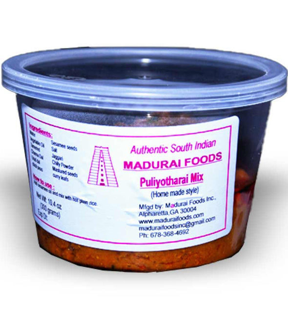 The puliyotharai mix is prepared with tamarind and jaggery cooked in oil and mixed with rice along with spices and curry leaves. It remains fresh till two days. puliyotharai is usually cooked on special occasions and festive days